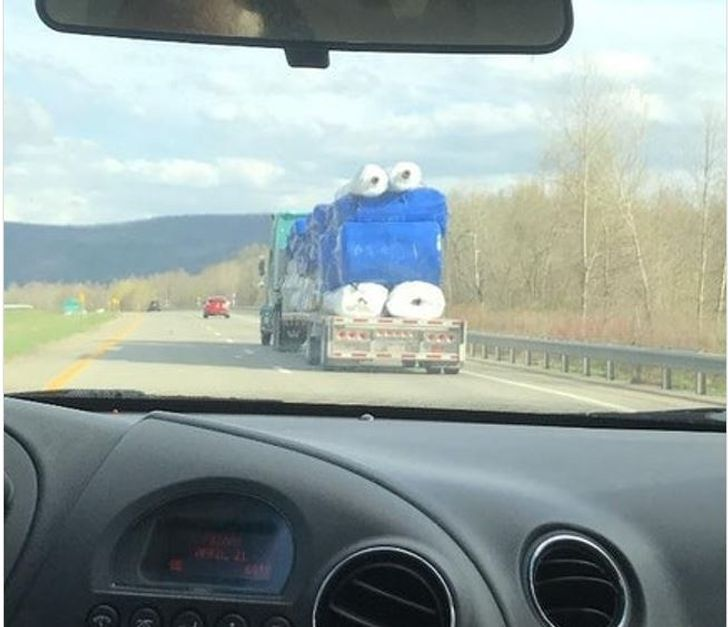 This truck carrying rolls of plastic looks like Cookie Monster.
