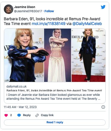 At 91, the legendary I Dream of Jeannie star continues to turn heads, most recently on the red carpet at the Remus Pre-Award Tea Time event at The Beverly Hills Hotel. Dressed in a navy satin blouse, black leggings, and pointed heels, complemented by elegant black-and-silver jewelry, Eden radiated ageless glamour. Social media immediately erupted with praise, with fans marveling at her energy, vitality, and effortless style.