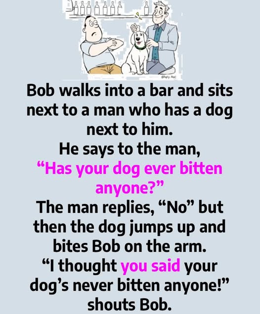 Suddenly, the dog leaps up and bites Bob’s arm. Chaos erupts. Chairs scrape. Eyes widen. Bob shouts at the man: “I was told your dog had never bitten anyone!”