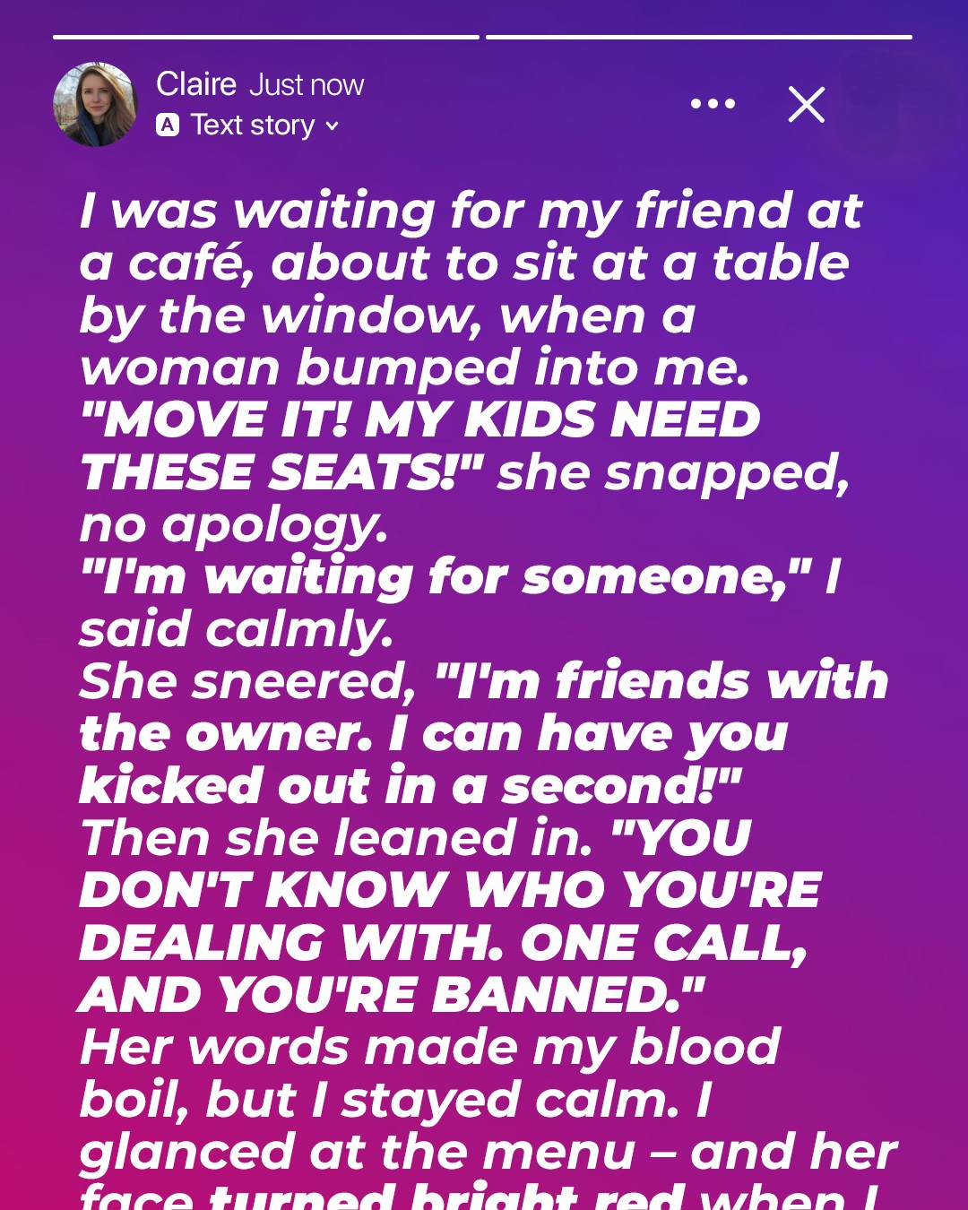 Claire looked around. The café wasn’t full—other tables were clearly available. But before she could suggest one, the woman’s voice grew louder. “You’re being selfish. Do you even know who I am?”