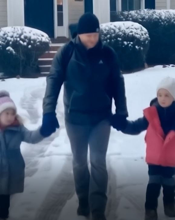 Every single morning at exactly 7:43 AM, he steps outside with his two little girls — one holding each hand — and walks them down the same snowy path.