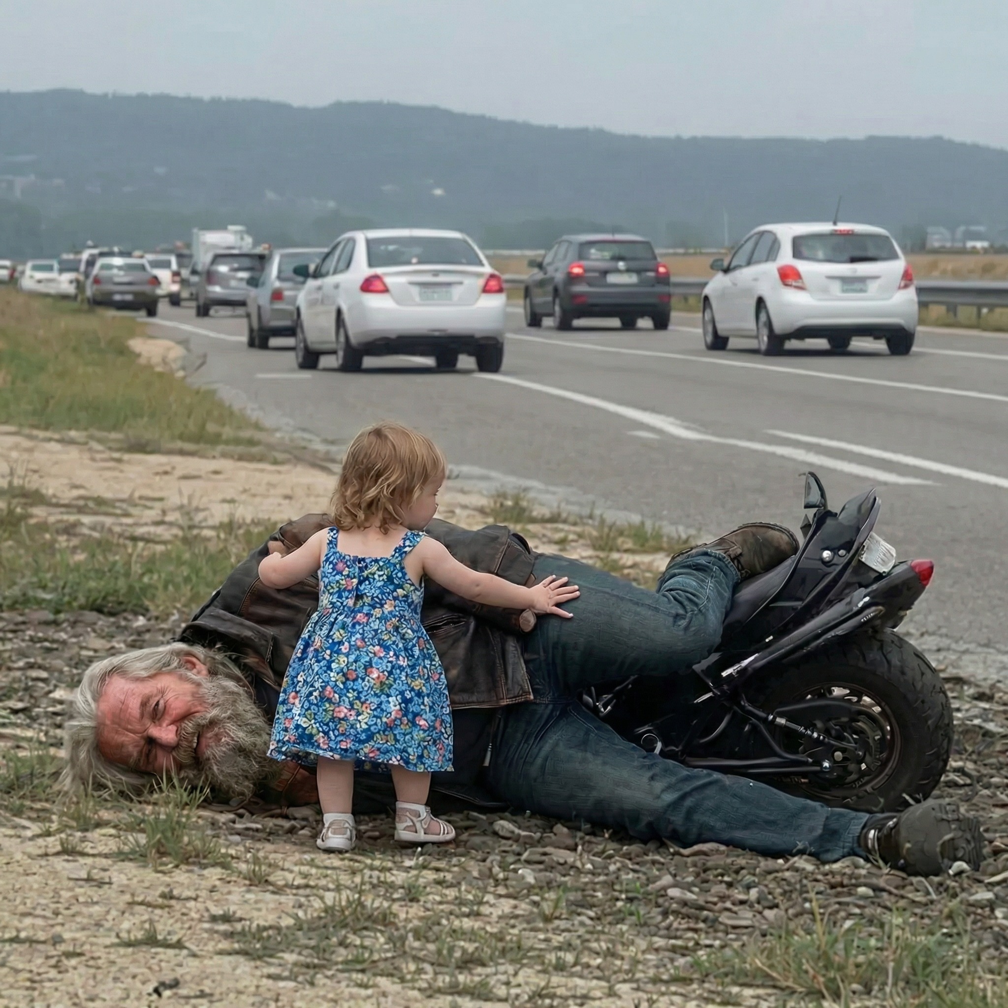 Even as police officers gently tried to lift her away, she clung tightly to the injured biker’s leg, her small hands shaking but determined.