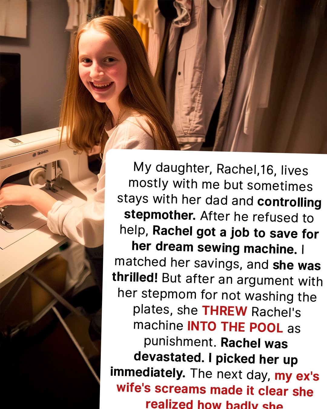 My daughter Rachel had spent months saving for her dream sewing machine. At sixteen, she juggled school, chores, and a part-time job at a fabric store with quiet determination. I was so proud, I matched her savings to help her reach her goal. When she finally brought that machine home, her smile said it all—it was the first thing she’d truly earned for herself.Then one weekend at her father’s house, everything changed.