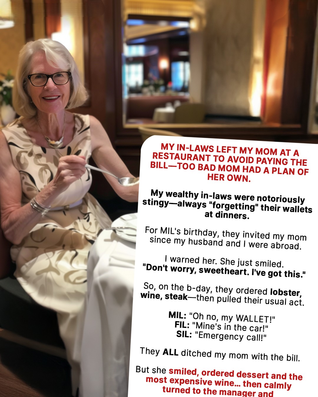 Just as predicted, my in-laws arrived in full glam mode and ordered like royalty—lobster ravioli, gold-flaked steak, $300 bottles of wine, artisanal appetizers. My mom? A modest pasta and water. She sat quietly and watched the performance unfold.When the bill landed—just over $1,500—everyone suddenly remembered they had somewhere else to be.