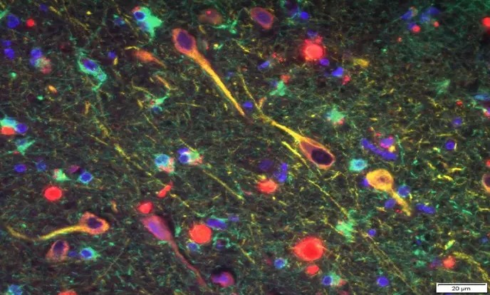 P. gingivalis’ gingipains (red) among neurons in the brain of a patient with Alzheimer’s. (Cortexyme) via sciencealert