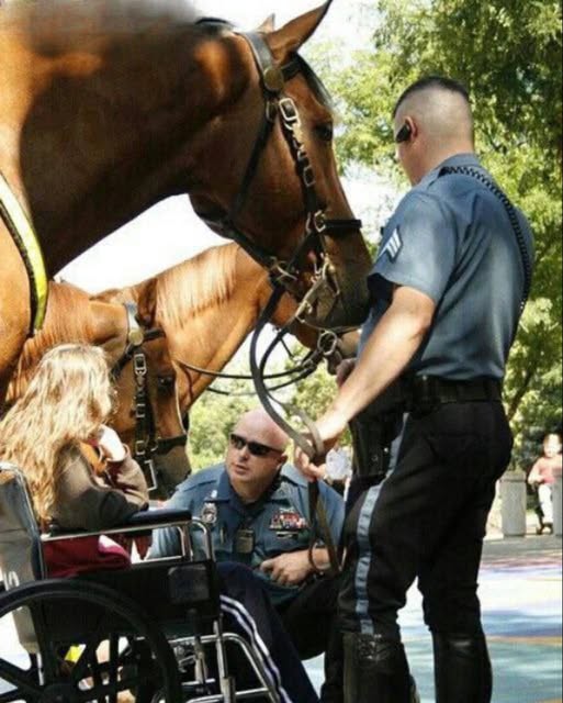 A young girl in a wheelchair approached the officers. Her wide eyes locked onto Luna, a tall chestnut mare whose coat gleamed in the golden light. Her mother stood beside her, gently holding the wheelchair, as the girl leaned forward, captivated by the gentle horse.Seeing this, one of the officers, Officer Martinez, knelt beside her. “Would you like to pet him?” he asked, nodding toward Luna. The girl reached out, her fingers trembling as she touched the horse’s soft muzzle. A quiet stillness settled around them, broken only by the sound of leaves rustling and the horse’s calm breathing.
