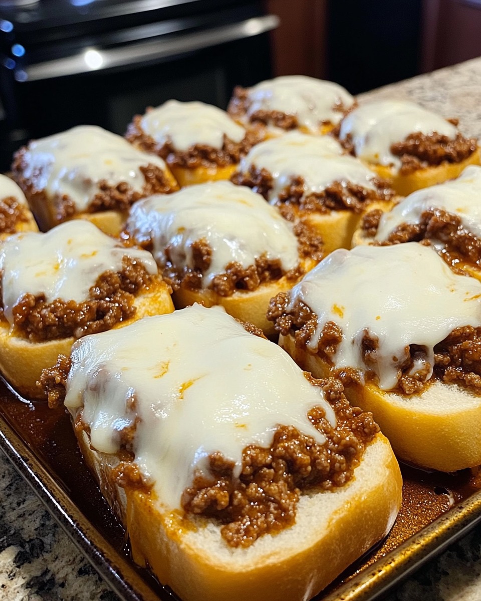 Step 6: Spoon the Sloppy Joe mixture onto each slice, then top with another slice of cheese.
