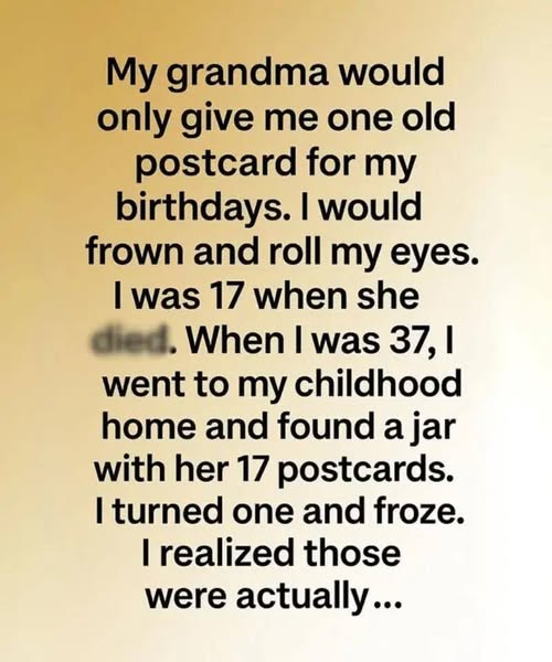 When she passed away, I was seventeen. Life moved fast. College, marriage, divorce—it all blurred together. Twenty years later, at thirty-seven, I returned to my childhood home. While sorting through old things, I found a small jar containing seventeen postcards—the ones she had given me every birthday. Curiosity pulled me in. As I examined each card, a strange, electric realization hit me: these weren’t just whimsical notes. They were clues.