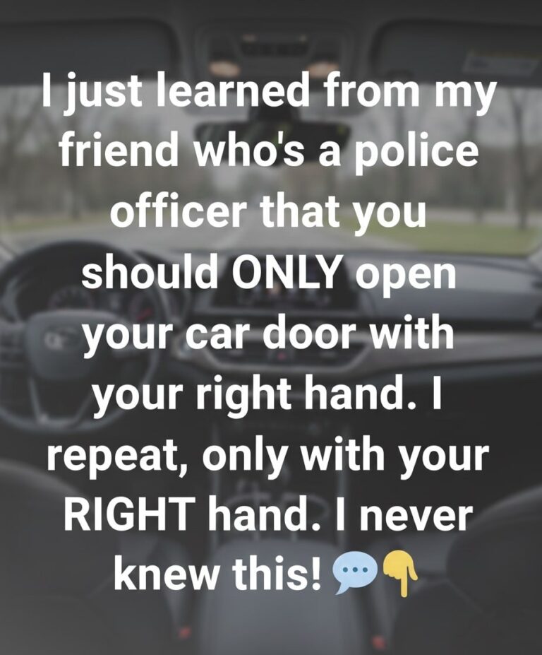 The advice comes from law enforcement officers and road-safety specialists around the world: drivers should always open their door with their right hand, not their left.