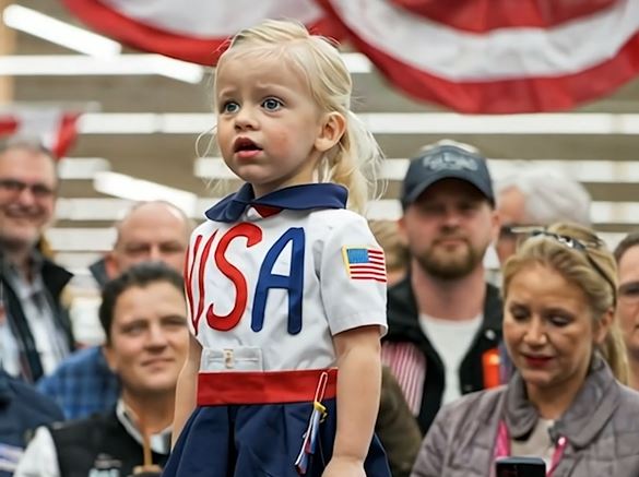 Dressed head-to-toe in a sparkly “USA” outfit and bursting with confidence, this pint-sized patriot stood tall in the middle of a busy supermarket — and then belted out a classic American anthem that brought everything to a halt.