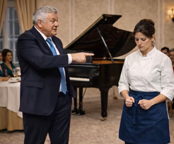 Mark smirked but didn’t release her. Instead, he put her on stage before the city’s wealthiest, turning a simple observation into a public spectacle. His daughter, Emma—a conservatory-trained prodigy—would play first. Then Anna would follow. If she won, she’d get her own restaurant. If she lost… no pay, no references, just humiliation.