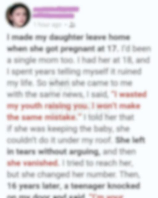 The memory of that doorway never truly left me. It remained fixed in my mind through the years that followed, a moment I replayed more often than I cared to admit. Sixteen years earlier, I stood there as a frightened, overwhelmed mother and made a decision that would change everything. My daughter, not yet seventeen, stood in front of me trembling as she told me she was pregnant. She needed comfort, reassurance, and love. Instead, she was met with rejection.