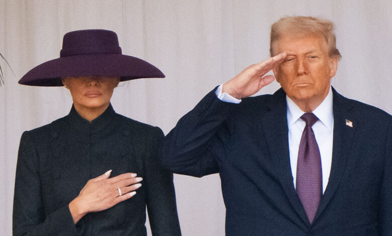 Upon arrival at Windsor Castle, Melania Trump’s wide-brimmed purple hat immediately sparked conversation. The accessory drew comparisons to her hat at the 2017 presidential inauguration, which went viral after a lighthearted moment where it blocked a kiss from her husband.