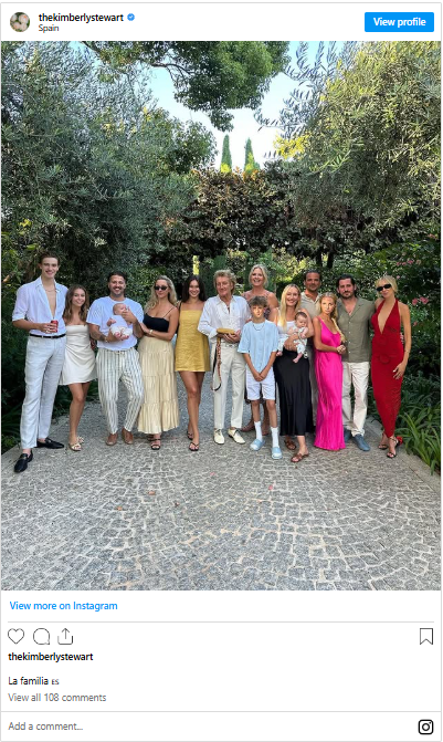 The double arrival sparked celebration across the Stewart clan. Fans also got a rare glimpse into the family’s close bonds when Stewart shared a heartwarming photo from a vacation in Spain. Seven of his eight children were present—Sean, Ruby, Renee, Liam, Alastair, Aiden, and Kimberly—alongside Stewart and his wife, Penny Lancaster, whose warmth and elegance reflect her role as both partner and stepmother.