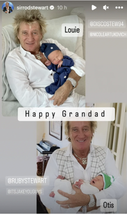 Stewart embraced grandfatherhood with the enthusiasm and playfulness fans know from his public persona. He shared news of Louie and Otis on social media, helped reveal Otis’s gender, and even performed a custom jingle for the newborns. Louie’s full name—Louie Mark Roderick Stewart—honors his grandfather, reflecting the love and admiration Stewart’s family holds for him.
