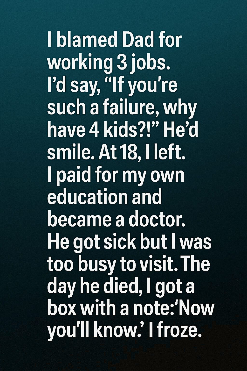 He apologized for his exhaustion, his silence, the way he sometimes seemed like a shadow rather than a father. And in those lines, I finally saw the truth: his absence was a form of devotion. I remembered every time I judged him as a teen, thinking I knew better. I had been blind.